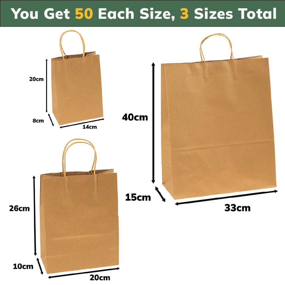 3 sizes: 14 x 8 x 20 cm, 20 x 10 x 26 cm, 33 x 15 x 40 cm (50 per size). Contains small, medium and large kraft paper bags to meet your different needs. These are the perfect range of sizes and excellent quality.