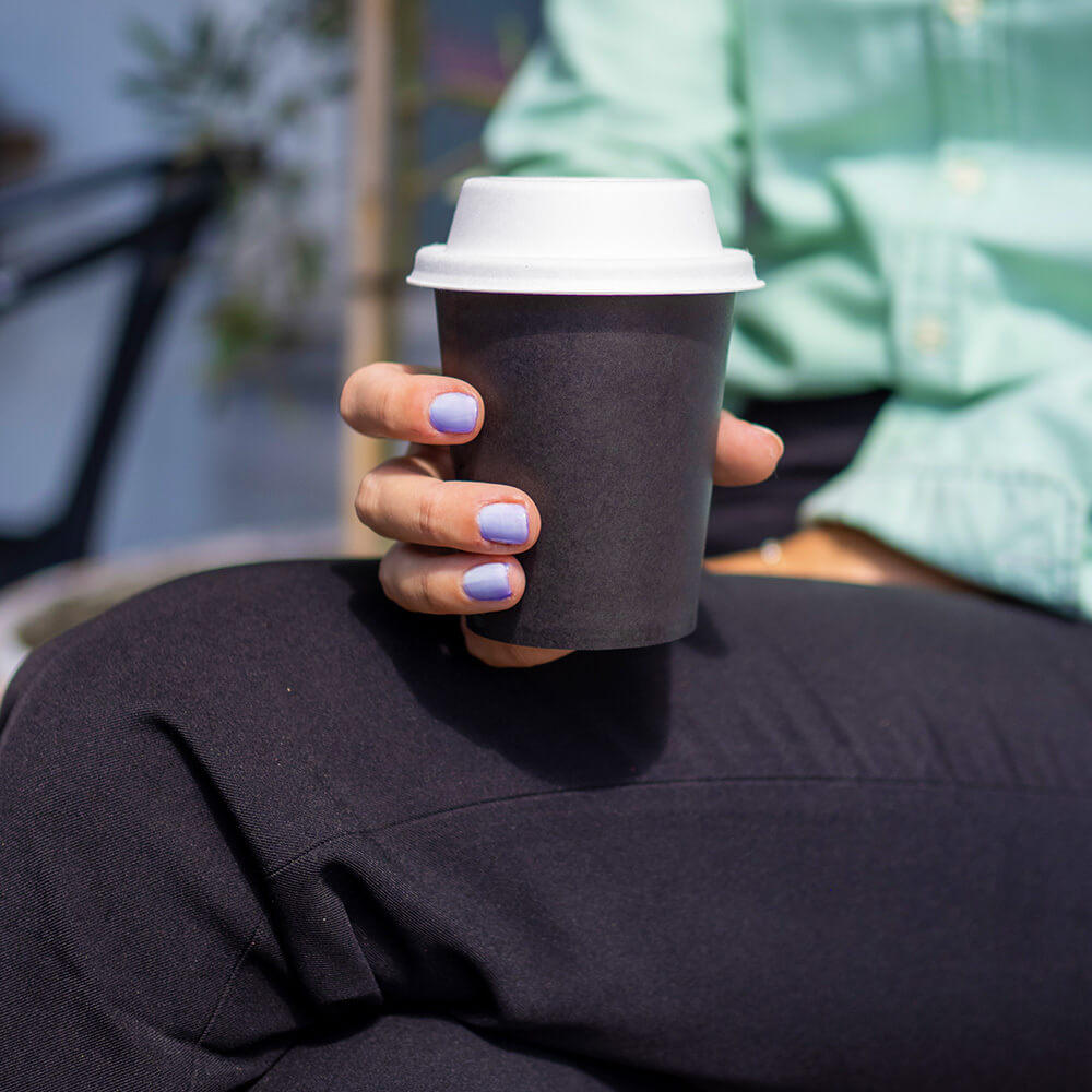 12oz takeaway coffee cups in black colour are perfect for hot beverages including coffee. A popular item for cafes, these black coffee cups are perfect for you to stamp and brand with your logo.
